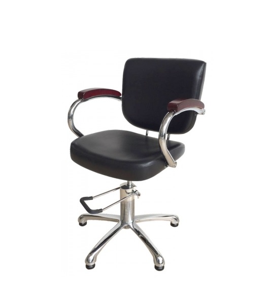 Парикмахерское кресло с хромированными металлическими подлокотниками и деревянными накладками. Подъем: гидравлика Основание: хромированное пятилучье