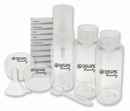 Dewal Дорожный набор баночек (Бутылка 50мл - 2 шт.+ бутылка 30мл +баночка 10гр - 2 шт.+ воронка + лопатка)