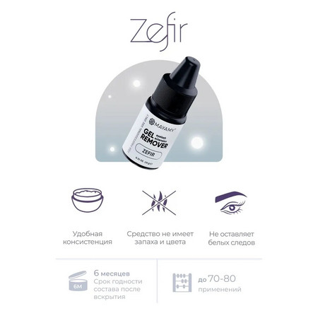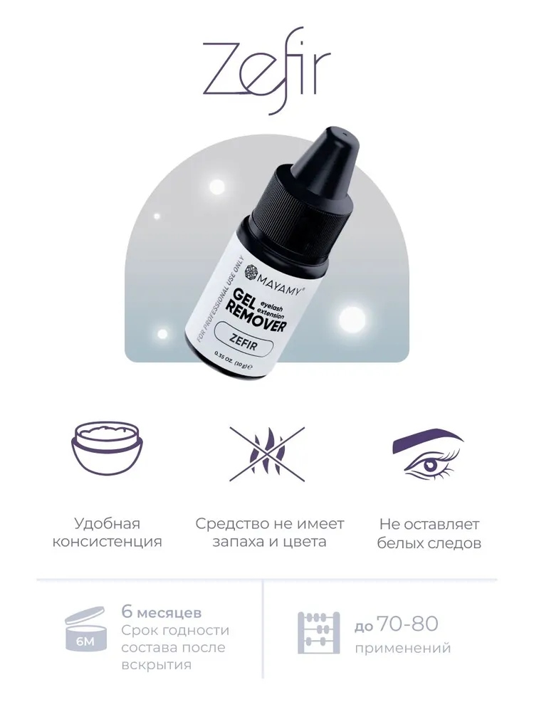 Ремувер MAYAMY Zefir используется для снятия наращенных ресниц. Подходит для мастера любого уровня, комфортен для клиента. Пластичная гелевая текстура препарата позволяет легко нанести и распределить его на ресницах. Жидкость не растекается, бережно обволакивает ресницы, быстро и эффективно растворяет клей в месте сцепки натуральных и искусственных ресниц.