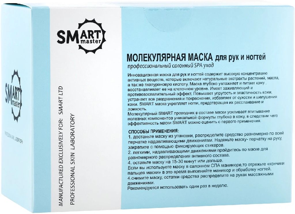 Инновационная маска для рук и ногтей Smart глубоко увлажняет и питает кожу, восстанавливает ее на клеточном уровне. Имеет заживляющий и противовоспалительный эффект. Повышает упругость и эластичность кожи, устраняет все раздражения и покраснения, избавляет от сухости и шелушения кожи. Маска укрепляет ногти, предотвращая их расслаивание и ломкость. Особенности • Содержит высокую концентрацию активных веществ, которые включают в себя натуральные экстракты растений, масла, а также гиалуроновую кислоту.• Молекулярный SMART-проводник в составе маски усиливает впитывание полезных компонентов уникальной формулы.• Профессиональный салонный SPA-уход.• Эффект уже с первого применения.