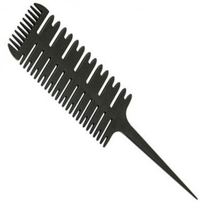 Принцип работы: отделяем горизонтальную или вертикальную прядь - прочесываем, потом сверху вставляем расческу для мелирования, немного сдвигаем расческу в сторону и поднимаем вверх. Зубцы на расческе имеют крючки, которые прядь через прядь цепляют и вытягивают волосы. Слой волос, который вытянулся крючками, подхватываем пальцем, подкладываем под него фольгу и наносим краску.Длина: 24 см.