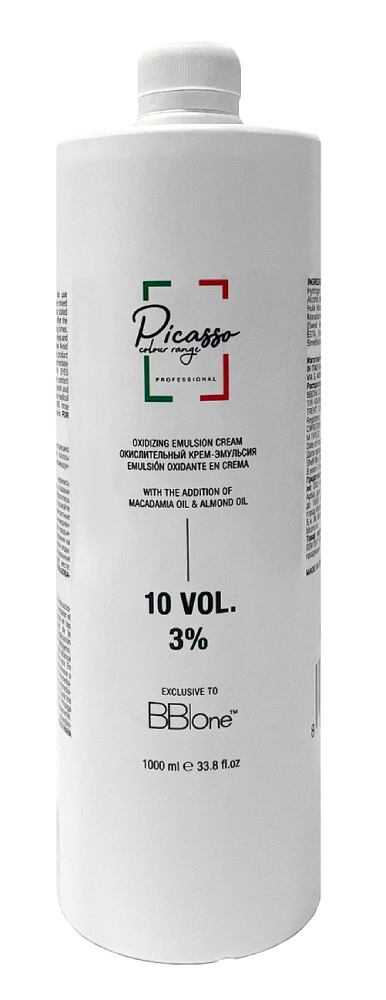 Оксидант Picasso содержит масло сладкого миндаля, масло макадамии, что делает процедуру окрашивания максимально щадящей, дает дополнительный уход волосам во время окрашивания.