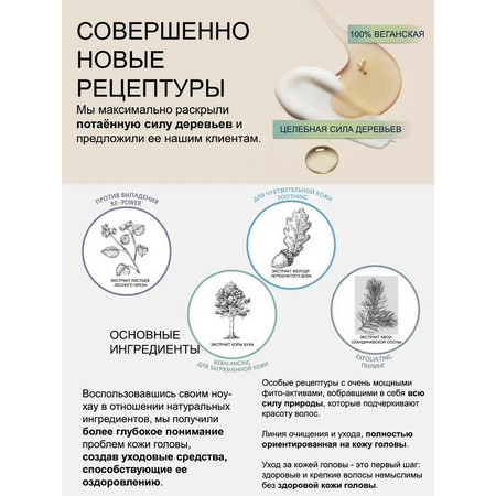 В основе рецептуры – природная целебная сила деревьев. Эти активные ингредиенты с выраженными противовоспалительными свойствами успокаивают кожу, устраняя покраснение, раздражение и зуд. Невероятно нежный и приятный в использовании, защищает и увлажняет кожу головы, способствуя ее восстановлению. Идеально подходит для всех типов кожи, особенно для чувствительной или раздраженной кожи головы. Экстракт желудя черешчатого дуба содержит множество активных ингредиентов, таких как дубильные вещества, сахара, флавоноиды и фенольные соединения, которые оказывают положительное воздействие на кожу головы. Обладает сильными вяжущими и успокаивающими свойствами. Богат антиоксидантными веществами. Оказывает питательное и увлажняющее действие. БЕЗ СОДИУМ ЛАУРЕТ СУЛЬФАТА, БЕЗ ПАРАБЕНОВ, БЕЗ КРАСИТЕЛЕЙ, ДЕРМАТОЛОГИЧЕСКИ ТЕСТИРОВАН