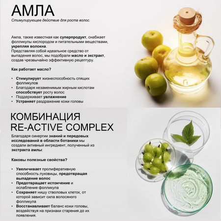 Идеально подходит для борьбы с выпадением волос, уплотняет и укрепляет структуру волос, придавая им новую силу и прочность. Масло облепихи, мощный суперпродукт для волос, укрепляет волокна и восстанавливает их эластичность. Масло и экстракт амлы, содержащие витамин С и незаменимые жирные кислоты, питают и стимулируют жизнеспособность спящих фолликулов, способствуя росту волос.