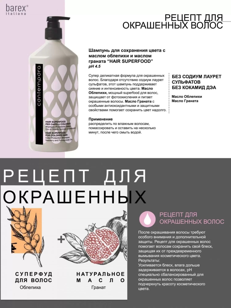 Суперделикатная формула для окрашенных волос. Благодаря отсутствию содиум лаурет сульфатов, этот шампунь поддерживает сияние и интенсивность цвета. Масло Облепихи, мощный superfood для волос, защищает от фотоокисления и питает окрашенные волосы. Масло Граната с особыми антиоксидантными и защитными свойствами помогает сохранить цвет надолго. БЕЗ СОДИУМ ЛАУРЕТ СУЛЬФАТОВ, БЕЗ КОКАМИД ДЭА, ДЕРМАТОЛОГИЧЕСКИ ТЕСТИРОВАН