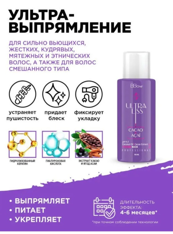 Классический кератиновый состав для максимально сильного выпрямления волос Ultra Liss Thermo Mask Cacao&Acai шаг 2 имеет уровень Ph 4,5 и идеально подходит для прогрессивного кератинового выпрямления и укрепления волос. Предназначен для сильно вьющихся, жестких, кудрявых, мятежных и этнических волос, а также для волос смешанного типа. Подходит для окрашенных и осветленных волос низкой, средней и высокой степени повреждения. Эффективно и сильно выпрямляет, питает и укрепляет волосы, устраняет пушистость, придает блеск и фиксирует укладку.