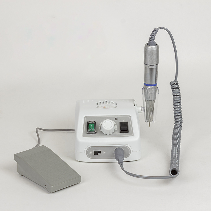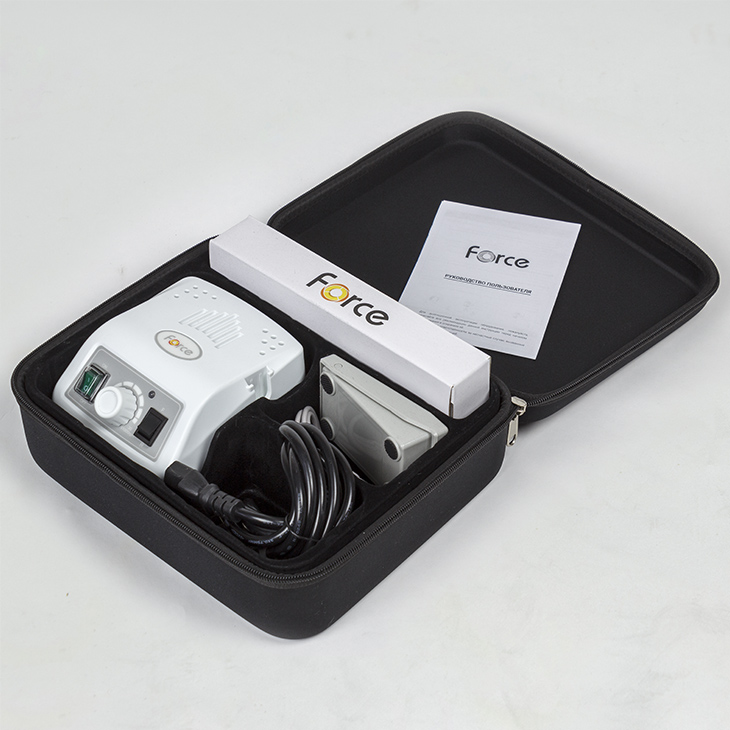 Производитель: ForceКомплектация: блок, ручка с микромотором, держатель наконечника, сумка, электрический шнур, ножная педаль. Характеристики: Корпус: пластик Мощность: 65 Ватт Максимальная частота оборотов: 35 000 в минуту. Вес наконечника: 200 грамм Питание: 110/220В Цанговый зажим: 2,35 мм («Евро-стандарт») Крутящий момент: 2.8 Н.см Цвет: бирюзовый, серый Гарантия: 2 года Аппарат для маникюра Force 315/107 – устройство, которое поможет быстро и безопасно произвести обработку ногтей клиентов. Такое маникюрное оборудование можно использовать и для проведения педикюра. Аппарат для маникюра включает блок питания и ручку с цанговым зажимом. На корпусе блока питания располагается регулятор скорости, реверс, углубления для расстановки фрез, держатель для ручки. Ручка с микромотором имеет удобный цанговый зажим, в котором устанавливаются необходимые фрезы. Замена инструмента занимает считанные секунды. С помощью удобной педали можно включить и выключить аппарат, когда руки мастера заняты. Для удо
