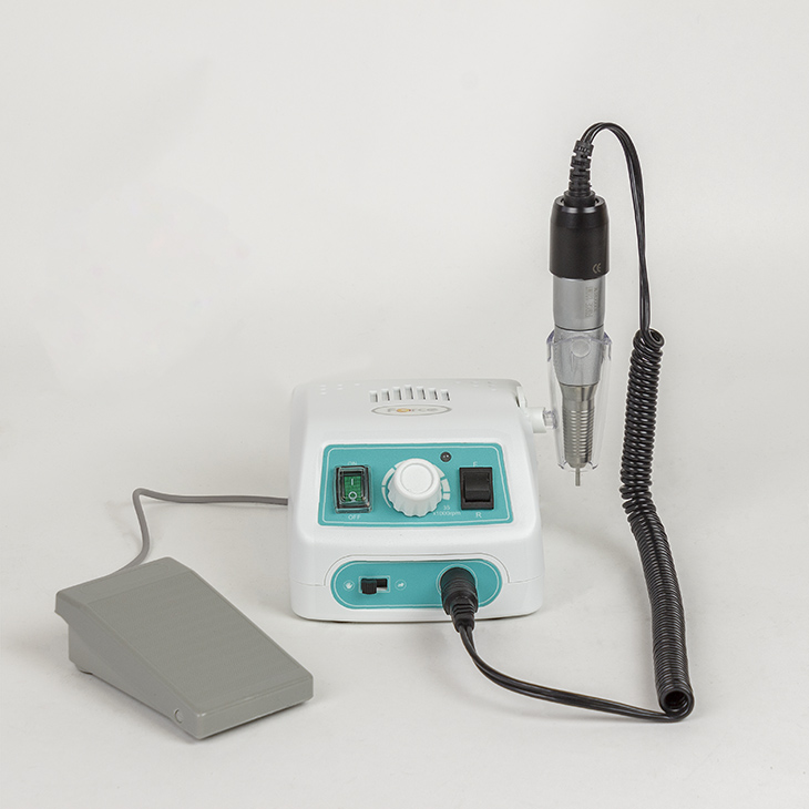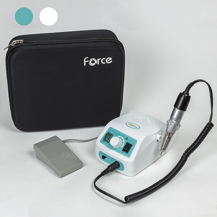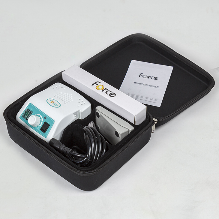 Аппарат для маникюра Force 315/120 с педальюПроизводитель: ForceКомплектация: блок питания, держатель наконечника, ручка с мотором, сумка, электрический шнур, инструкция, ножная педаль. Характеристики: Корпус: пластик Мощность: 65 Ватт Максимальная частота оборотов: 30 000 в минуту. Вес наконечника: 170 грамм Питание: 110/220В Цанговый зажим: 2,35 мм («Евро-стандарт») Крутящий момент: 2.8 Н.см Цвет: бирюзовый, серый Гарантия: 2 года Аппарат для маникюра Force 315/120 – профессиональное устройство, которое повысит эффективность мастеров ногтевого сервиса. Маникюрный аппарат состоит из блока питания и ручки-фрезера. Для сменных фрез есть отведенное место в верхней части блока, чтобы нужный инструмент был всегда под рукой. Замена фрезы не требует особых усилий благодаря удобному цанговому зажиму. Регулировать скорость и направление вращения можно с передней панели блока. При необходимости устройство можно включить или выключить с помощью удобной педали. Маникюрное оборудование складывается в ко