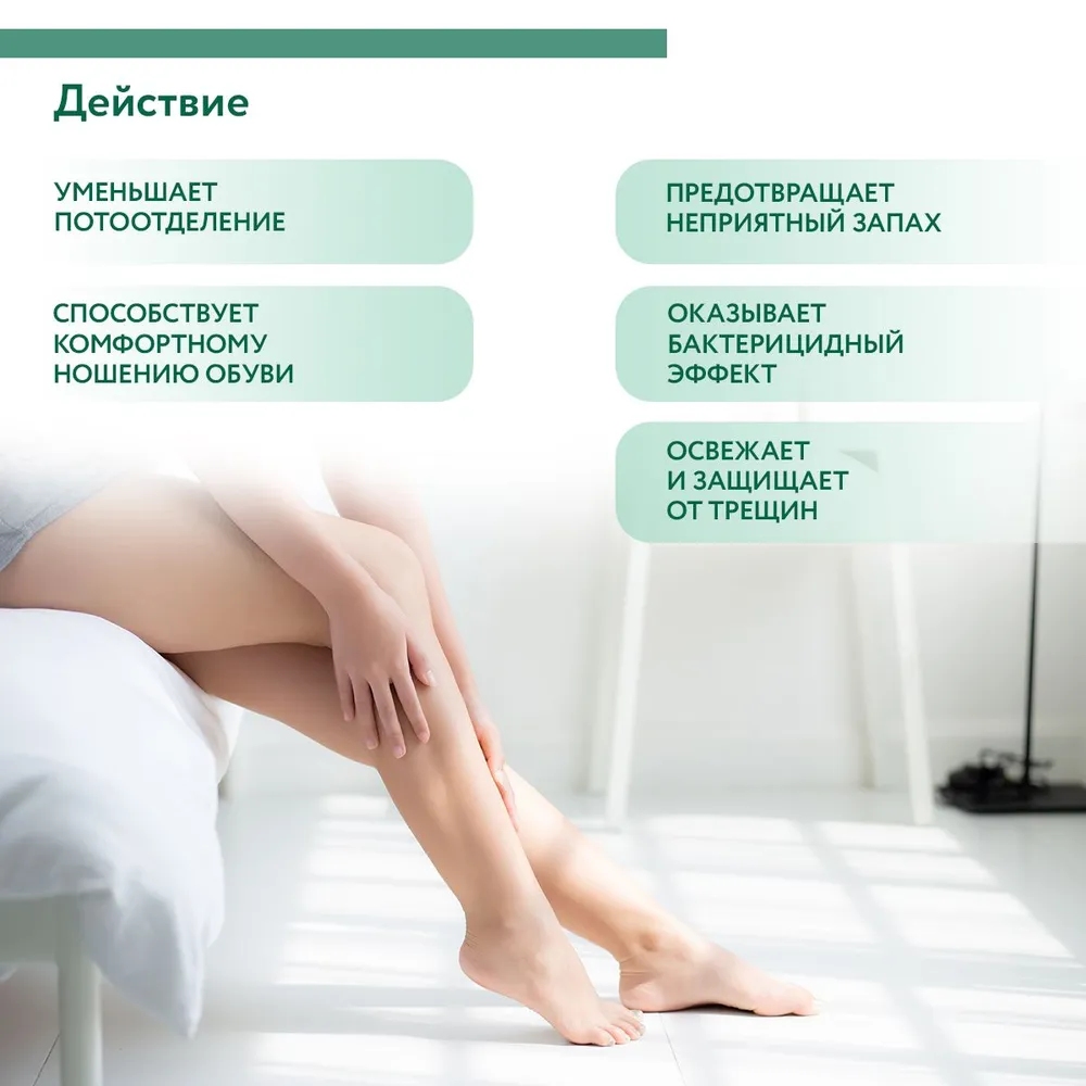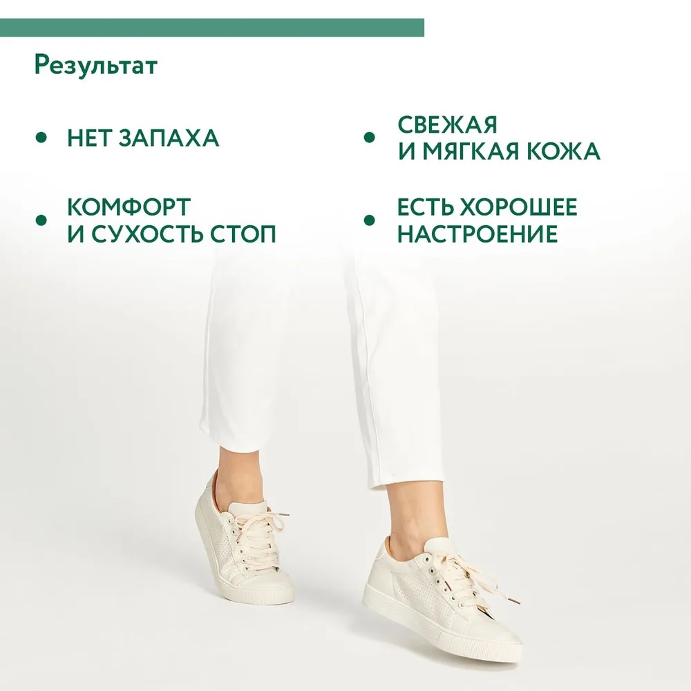 Распылить на чистую сухую кожу стоп и подождать до полного впитывания. Не смывать. Меры предосторожности: избегать попадания средства в глаза и на повреждённую кожу. Во избежание индивидуальной непереносимости компонентов перед применением тестировать на маленьком участке кожи. Использовать по назначению.