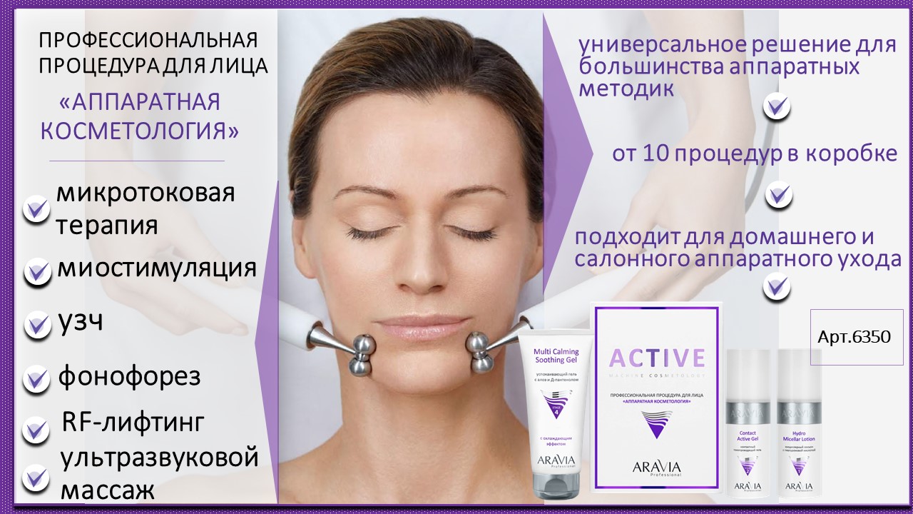 Профессиональная процедура для лица «Аппаратная косметология» представляет собой универсальное решение для проведения широкого спектра аппаратных методик. Набор содержит три необходимых этапа для проведения аппаратных процедур по лицу и повышение их эффективности. Универсальное решение для большинства аппаратных методик. Соблюдайте протокол процедуры и инструкцию к вашему прибору. Курс процедур: в одном наборе — до 10 процедур. 1. Aravia Professional Мицеллярный лосьон с гиалуроновой кислотой Hydra Micellar Luotion -150 мл 2. Aravia Professional Контактный токопроводящий гель Contact Active Gel- 150 мл 3. Aravia Professional Успокаивающий гель с алоэ и Д-пантенолом Multi Calming Soothing Gel- 200 мл
