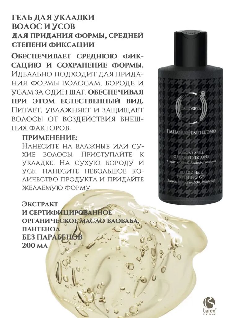 BAREX OLIOSETA GENTILUOMO / Гель для укладки волос и усов 200 мл