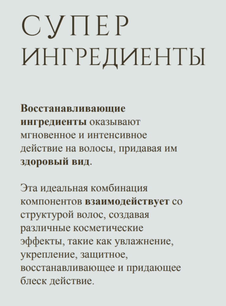 ШАМПУНЬ ПИТАТЕЛЬНЫЙ с маслом арганы и маслом семян льна Мгновенно придает волосам великолепную текстуру, оставляя их мягкими, гладкими и супер блестящими. Ценнейшие органически сертифицированные Масла Арганы и Семян Льна обеспечивают глубокое и длительное увлажнение, силу и плотность волос. Расслабляет и успокаивает кожу головы. Идеален для любого типа волос, в особенности для волос, подвергающихся химическим процедурам, благодаря деликатной формуле без Содиум Лаурет Сульфатов. КРЕМ ДЛЯ ВОЛОС ALL IN ONE с аминокомплексом, маслом арганы, маслом семян льна и пантенолом Многофункциональный крем совмещает в себе функции идеального ухода за волосами. В основе формулы крема эффективные восстанавливающие ингредиенты. Комплекс из 11 аминокислот укрепляет волосы изнутри, увлажняет, защищает косметический цвет от вымывания, обеспечивает термозащиту, противодействует вредным внешним факторам. Аргановое масло снижает ломкость, интенсивно питает и предотвращает появление секущихся кончиков. Масло семян льн