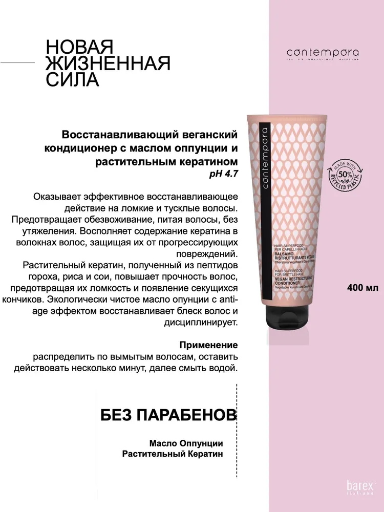 BAREX СОNTEMPORA Кондиционер восстанавливающий с кератином и маслом опунции 400 мл.
