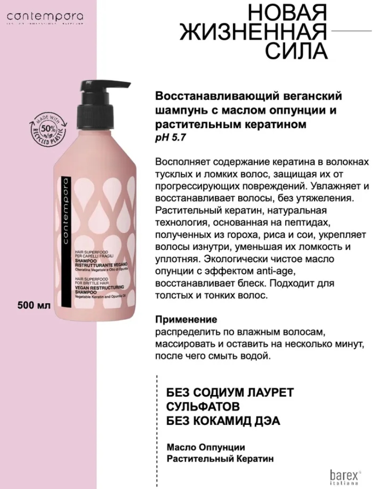 Специальный шампунь для ломких и тусклых волос. Восполняет содержание кератина в волокнах волос, защищая их от прогрессирующих повреждений. Оказывает увлажняющее действие, восстанавливая волосы, без утяжеления. Растительный кератин, натуральная технология, основанная на пептидах, полученных из гороха, риса и сои, укрепляет волосы изнутри, уменьшая их ломкость и уплотняя. Экологически чистое масло опунции с эффектом anti-age, восстанавливает блеск. Подходит для толстых и тонких волос. БЕЗ СОДИУМ ЛАУРЕТ СУЛЬФАТОВ, БЕЗ КОКАМИД ДЭА, ДЕРМАТОЛОГИЧЕСКИ ПРОТЕСТИРОВАН.