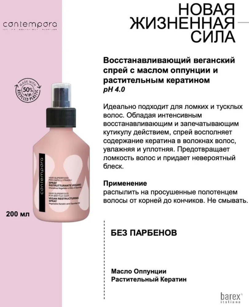 BAREX СОNTEMPORA Спрей восстанавливающий с кератином и маслом опунции 200 мл.
