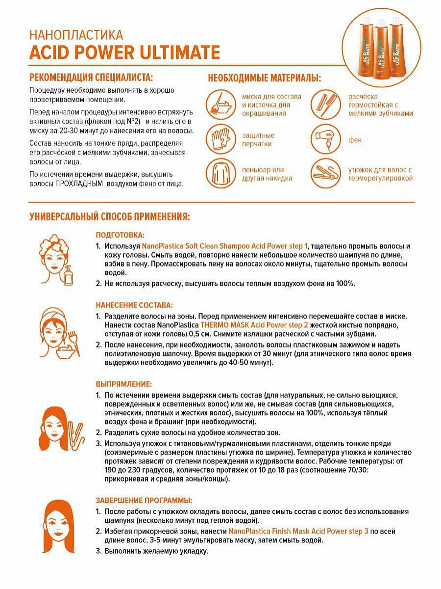 Используя NanoPlastica Soft Clean Shampoo Acid Power step 1, тщательно промыть волосы и кожу головы. Смыть водой, повторно нанести небольшое количество шампуня по длине, взбив в пену. Промассировать пену на волосах около минуты, тщательно промыть волосы водой. Не используя расческу, высушить волосы теплым воздухом фена на 100%. НАНЕСЕНИЕ СОСТАВА: 1. Разделите волосы на зоны. Перед применением интенсивно перемешайте состав в миске. Нанести состав NanoPlastiсa THERMO MASK Acid Power step 2 жесткой кистью попрядно, отступая от кожи головы 0,5 см. Снимите излишки расческой с частыми зубцами. 2. После нанесения, при необходимости, заколоть волосы пластиковым зажимом и надеть полиэтиленовую шапочку. Время выдержки от 30 минут (для этнического типа волос время выдержки необходимо увеличить до 40-50 минут). ВЫПРЯМЛЕНИЕ: 1. По истечении времени выдержки смыть состав (для натуральных, не сильно вьющихся, поврежденных и осветленных волос) или же, не смывая состав (для сильновьющихся, этнических, плотных и жестких волос)