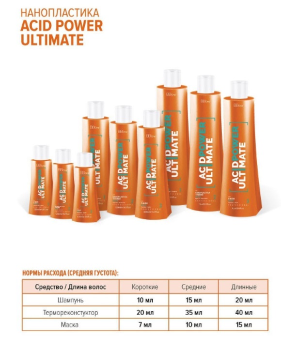 Нанопластика Acid Power содержит комплекс натуральных кислот и аминокислот, что позволяет выпрямить волосы любой сложности. Имеет приятный аромат свежести и подходит для работы с подростками и женщинами в положении. Может применяться на осветленных и мелированных волосах. Состав придает волосам зеркальную гладкость и блеск. Активные ингредиенты: лимонная, молочная и фруктовая кислоты, гидролизованный кератин, аргановое масло, экстракт розы, аминокислоты. Состав набора: шампунь и термореконструктор.