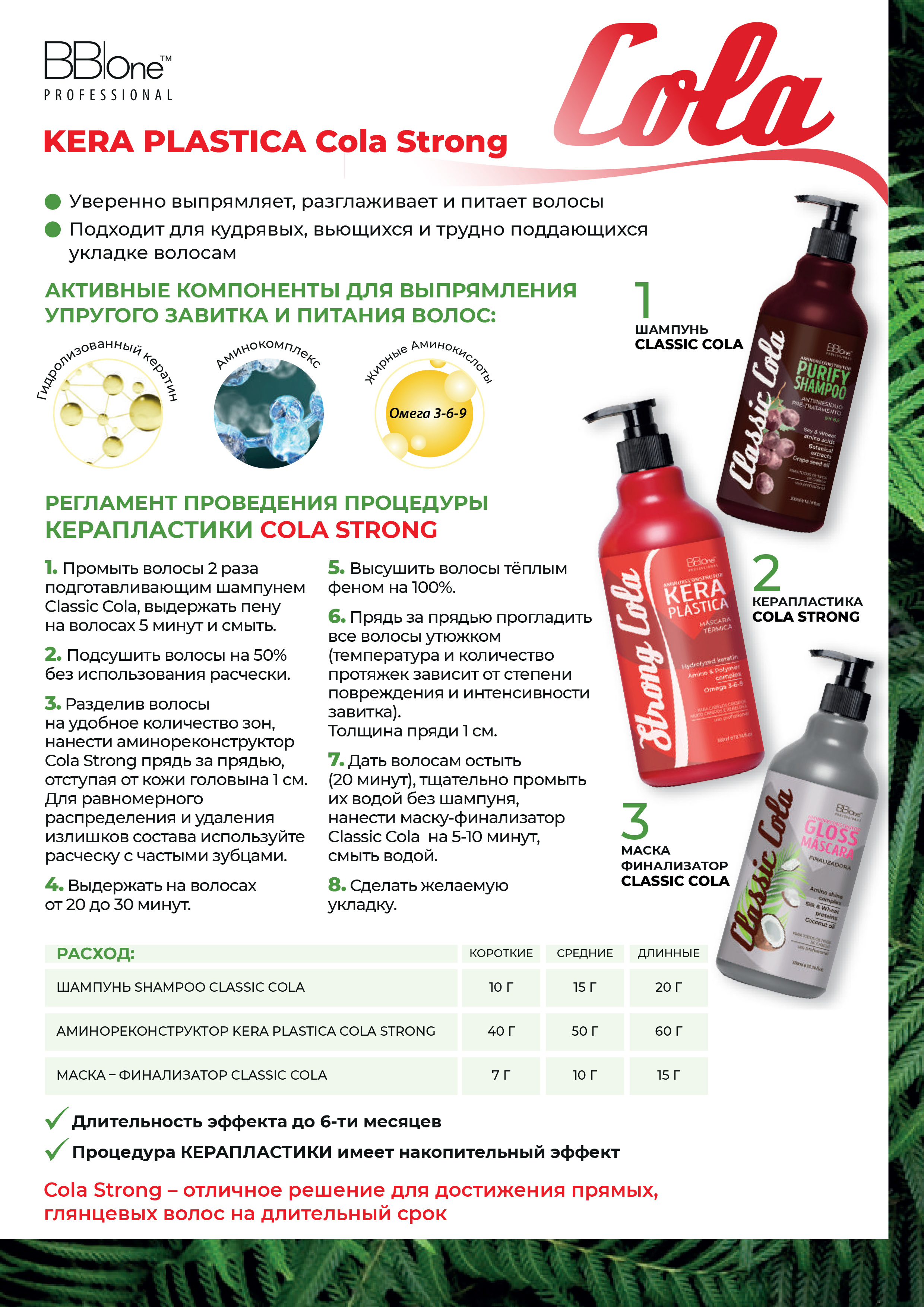 Состав для аминореконструкции волос керапластика Cola Strong уверенно выпрямляет, разглаживает и питает волосы. Подходит для кудрявых, вьющихся и трудно поддающихся укладке волосам. Содержит активные компоненты для выпрямления упругого завитка и питания волос : Гидролизованный кератин Аминокомплекс* Жирные Аминокислоты Омега 3-6-9 Длительность эффекта до 6-х месяцев Процедура КЕРАПЛАСТИКИ имеет накопительный эффект Cola Strong – отличное решение для достижения прямых, глянцевых волос на длительный срок. Каждый из составов для реконструкции волос линии Cola содержит комплекс Amino & Polymer complex– специальный набор аминокислот и полимеров для максимального омоложения волосяной структуры и защиты волос от различных повреждений.