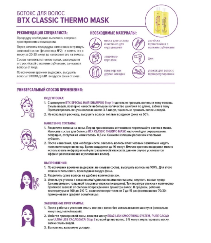 1 Вымыть волосы шампунем. 2 Высушить феном. 3 Нанести маску step 2 на пряди на 10 мин. 4 Не смывая состав, высушить волосы на 100%. 5 Обработать пряди утюжком (t 160-210гр) 6 Смыть состав с волос без использования шампуня. 7 Избегая прикорневой зоны, нанести маску step 3 из ассортимента BB one на 5 мин., смыть водой. 8 Выполнить желаемую укладку. Примечание: для получения ожидаемого результата рекомендуется проконсультироваться со специалистом.