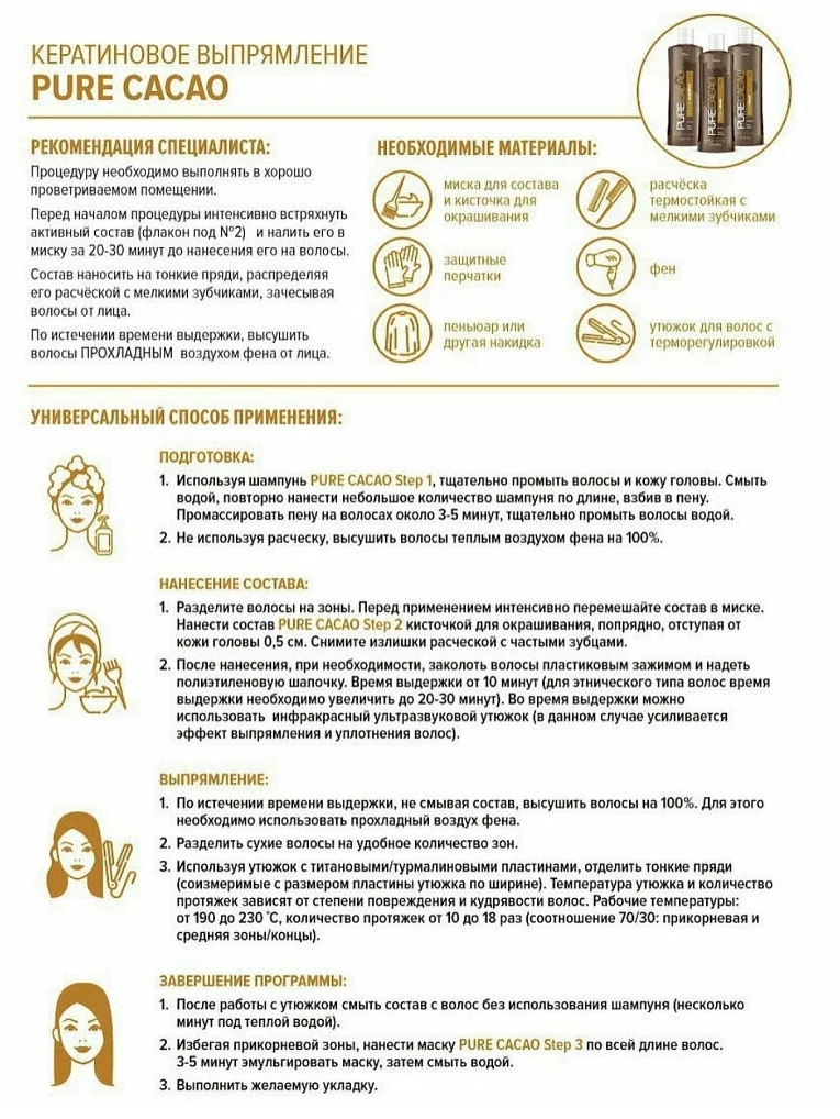 1. Перед нанесением термореконструктора используйте подготавливающий шампунь для процедуры ULTRA LISS CACAO&ACAI DEEP CLEAN SHAMPOO. 2. Разделите волосы на зоны. Перед применением интенсивно перемешайте состав в миске. Нанесите состав жесткой кистью попрядно, отступая от кожи головы 0,5 см. Снимите излишки расческой с частыми зубцами. 3. После нанесения, при необходимости, заколите волосы пластиковым зажимом и наденьте полиэтиленовую шапочку. Время выдержки от 10 минут (для этнического типа волос время выдержки необходимо увеличить до 20-30 минут). Во время выдержки можно использовать инфракрасный ультразвуковой утюжок (в данном случае усиливается эффект выпрямления и уплотнения волос). 4. По истечении времени выдержки, не смывая состав, высушить волосы на 100%. Для этого необходимо использовать прохладный воздух фена. 5. Приступить к процессу выпрямления. Действие: 4-6 месяцев
