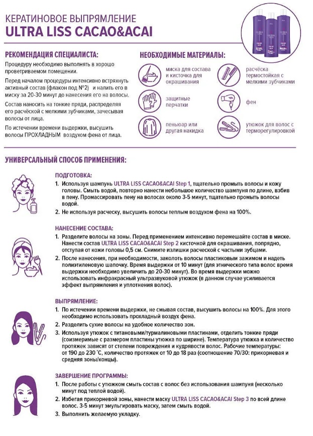 Классический кератиновый состав Ultra Liss Cacao&Acai вобрал в себя все наиболее сильные и питательные ингредиенты. Создан для прогрессивного кератинового выпрямления и укрепления волос. Предназначен для сильно вьющихся, жестких, кудрявых, мятежных и этнических волос, а также для волос смешанного типа. Подходит для окрашенных и осветленных волос низкой, средней и высокой степени повреждения. Эффективно и сильно выпрямляет, питает и укрепляет волосы, устраняет пушистость, придает блеск и фиксирует укладку.Действие: 4-6 месяцевАктивные ингредиенты: гидролизованный кератин, гиалуроновая кислота, экстракты: какао, коры корицы, ягод асаи и сенегальской акации; оливковое и кокосовое масла, протеины пшеницы и сои, аминокислоты.Не содержит формальдегид, не вызывает аллергию, не жирнит волосы. Время выдержки – 10-20 минут.Шаг 1: Ultra Liss Deep Clean Shampoo Cacao&Acai step 1 Ph 9Шаг 2: Ultra Liss THERMO Mask Cacao&Acai step 2 Ph 4,5Шаг 3: Ultra Liss Ultrarich Shine Mask Cacao&Acai step 3 Ph 3,5