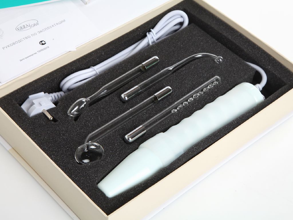 Современный портативный аппарат Дарсонваль Gezatone - аппарат для терапевтического воздействия слабым импульсным током высокого напряжения и частоты. Оснащен 4 стеклянными электродами для проведения процедур лицу и по телу: “грибок”, “лепесток”, “капля”, “расческа”, с возможностю регулировки уровня интенсивности. Импульсный массажер помогает решить не только проблемы кожи, но и помогает в борьбе с облысением и другими проблемами волос. Поэтому процедуры с использованием прибора для ухода за кожей Дарсонваль Gezatone органично войдут в комплексный курс процедур, улучшающих внешний вид и состояние кожи. Корпус аппарата имеет силиконовое покрытие, что обеспечивает удобство и комфорт в работе, а так же дополнительную изоляцию корпуса. Области применения прибора Воздействие на кожу лица и шеи: проблемная кожа, угревая сыпь зрелая кожа со сниженным тонусом, дряблостью и наличием морщин бледная со сниженным питанием кожа жирная пористая кожа Воздействие на кожу головы: укрепление волосяных луковиц и, как результ