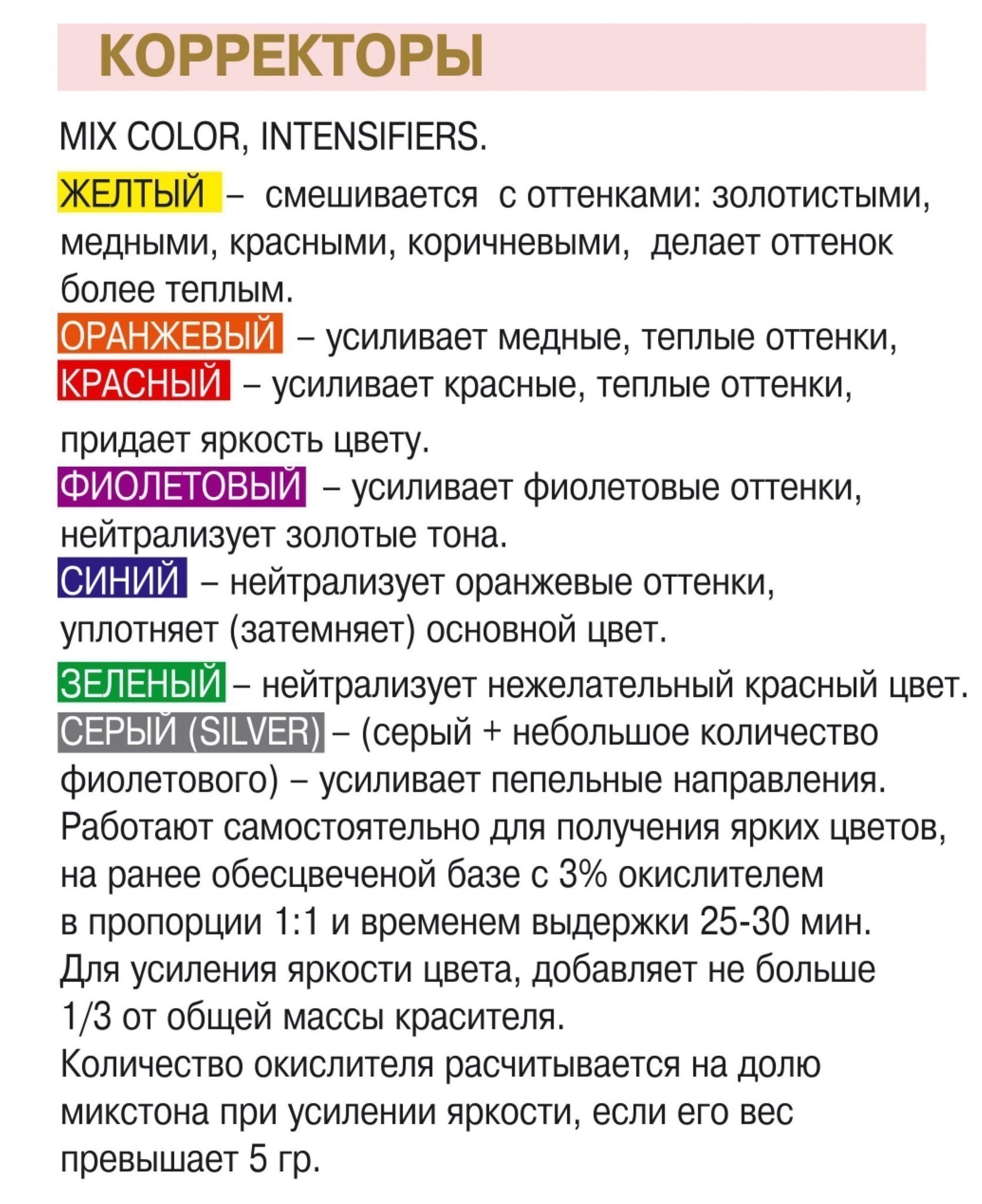 1. При работе с основной палитрой: - Тон в тон или темнее - 3%, 1:1, 30-35 минут. - На 1 уровень светлее - 6%, 1:1, 35 минут. - На 2 уровня светлее - 9%, 1:1, 35-40 минут. - На 3 уровня светлее - 12%, 1:1, 40-45 минут. 2. При тонировании: - Тонирование - 3%, 1:2, 5-25 минут. 3. При работе с оттенками экстра-блонд: - До 4 уровней светлее - 9%, 1:2, 55 минут. - До 5 уровней светлее - 12%, 1:2, 55 минут. 4. Окрашивание седых волос (% седых волос): 30%-50% - 1 часть натурального + 2 части выбранного оттенка, 6% (1:1), 45 минут. 50%-70% - 1 часть натурального + 1 часть выбранного оттенка, 6% (1:1), 45 минут. 70%-100% - 2 части натурального + 1 часть выбранного оттенка, 6% (1:1), 45 минут. 5. Применение корректоров: - Работают самостоятельно для получения ярких цветов на ранее обесцвеченной базе 1:1 (3%), время выдержки 25-30 минут. - Применяются для усиления яркости цветового направления красителя. Добавляются до 1/3 от общей массы красителя. На долю корректора количество окислителя рассчитывается, если его