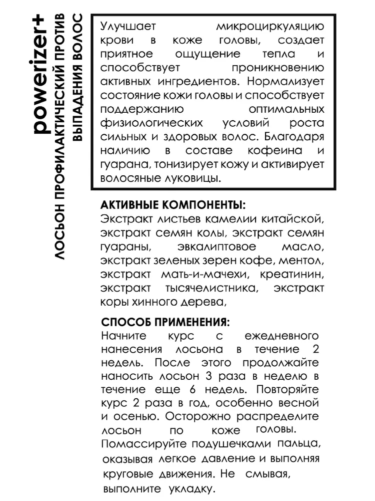 Улучшает микроциркуляцию крови в коже головы, создает приятное ощущение тепла и способствует проникновению активных ингредиентов. Нормализует состояние кожи головы и способствует поддержанию оптимальных физиологических условий роста сильных и здоровых волос. Благодаря наличию в составе кофеина и гуарана, тонизирует кожу и активирует волосяные луковицы.