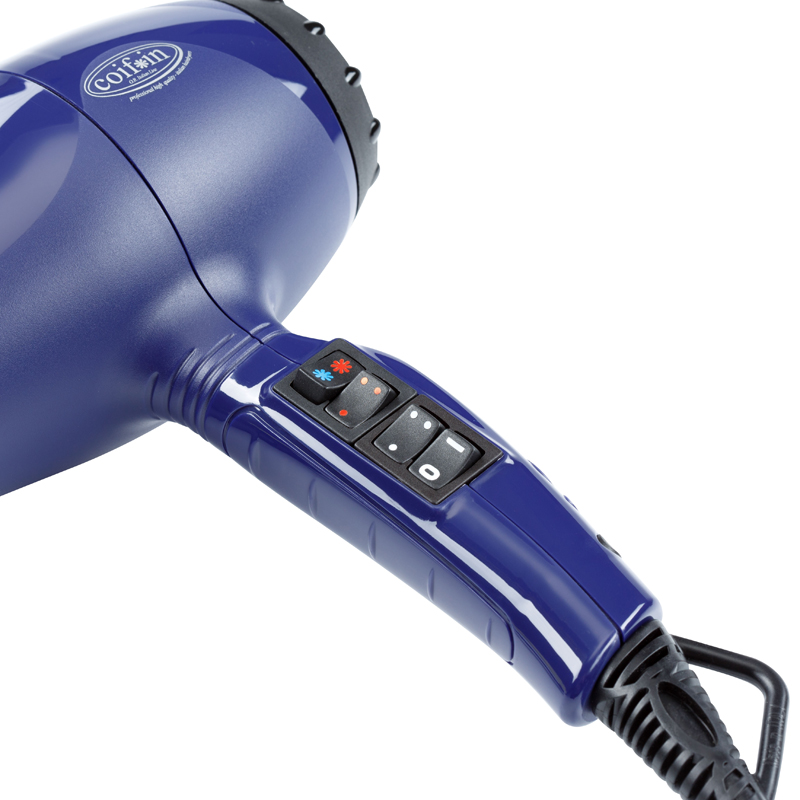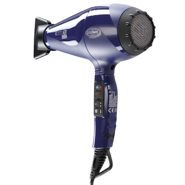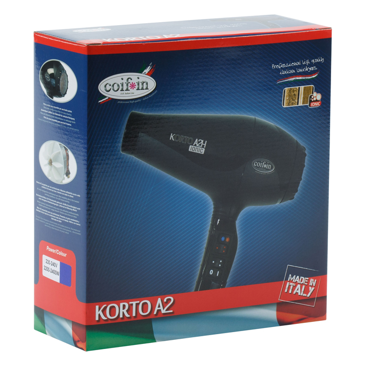 Coifin KA2 R Korto Ionic Blue – фен высокой мощности с ионизатором в компактном корпусе длиной 20,5 см. Цвет - тёмно-синий. Фен имеет кнопку Cold Shot, выдувает воздушный поток в 6 комбинациях скорости и температуры. Весит всего 531 грамма и имеет современный эргономичный дизайн. Мощность фена регулируется в диапазоне от 2200 до 2400 Ватт и подойдёт для использования в салоне красоты и быстрой сушки волос в домашних условиях. Ионизатор выдуваемого воздуха, насыщает его отрицательно заряженными ионами. Ионы придают волосам гладкость и блеск, сводят к нулю образование "статического электричества", а также уменьшают время сушки, сушка становится быстрее даже при использовании более низкой температуры. Профессиональный AC-мотор переменного тока выдумает 88 кубометров воздуха в час при скорости 162 км/ч. Мотор изготовлен в Италии и рассчитан на ежедневное интенсивное использование в салоне красоты. Максимальный уровень надёжности обеспечивает крыльчатка (вентилятор), закреплённый латунной гайкой. 6 ком
