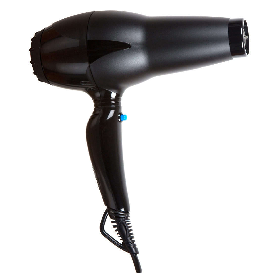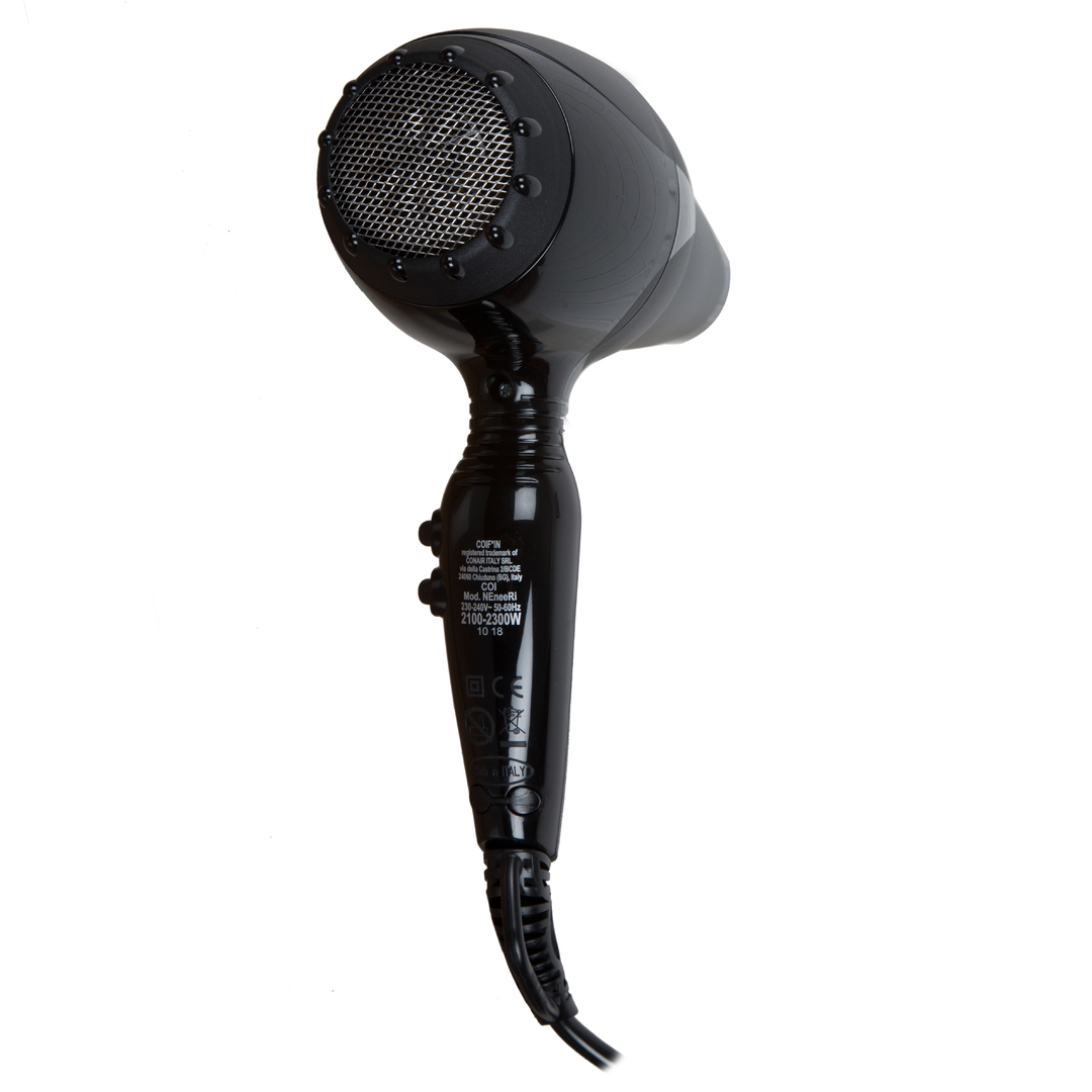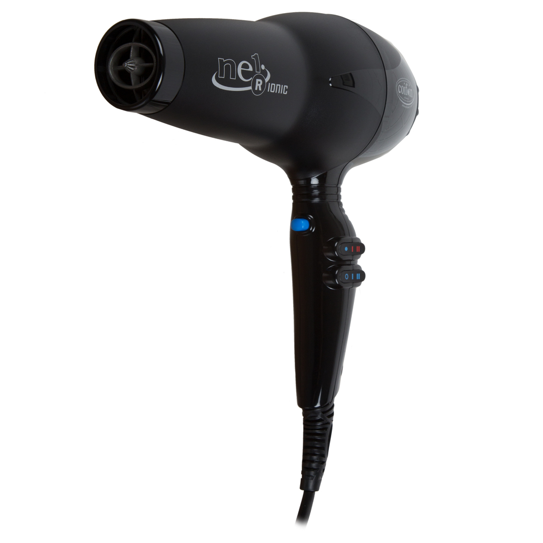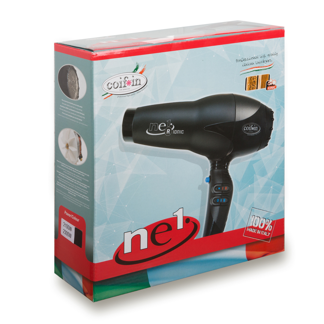 Coifin NE1 R Nexus Ionic (чёрный) – мощный фен классической удлинённой формы с ионизатором. Кнопки переключения режимов расположены на боковой части ручки. Фен имеет кнопку охлаждения Cold Shot, выдувает воздушный поток в 6 комбинациях скорости и температуры. Весит 561 грамм и имеет эргономичный дизайн. Мощность регулируется в диапазоне от 2100 до 2300 Ватт, она подойдёт для использования самым требовательным парикмахерам в салоне красоты и быстрой сушки волос в домашних условиях. Ионизатор выдуваемого воздуха, насыщает его отрицательными ионами. Ионы придают волосам гладкость и блеск, сводят к нулю образование "статического электричества", а также уменьшают время сушки, сушка становится быстрее даже при использовании режима низкой температуры. Профессиональный AC-мотор переменного тока производит 87,3 м³ выдуваемого воздуха в час при скорости 155 км/ч. Мотор изготовлен на собственной фабрике в Италии и рассчитан на ежедневную долгую работу при самой интенсивной, шоковой загрузке. Максимальный уров