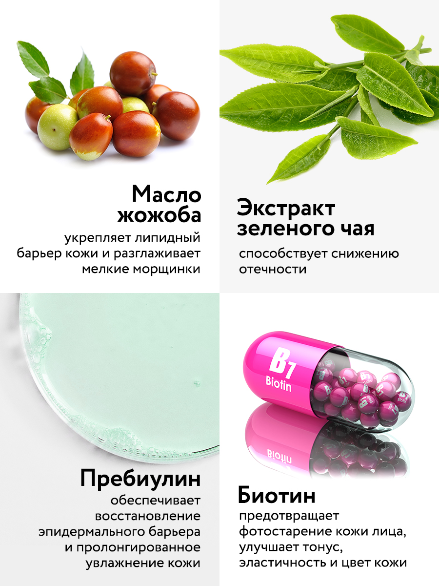 Крем-сыворотка для ухода за деликатной областью вокруг глаз для улучшения состояния микробиома и предотвращения процессов старения. Пребиулин нормализует уровень увлажнения гидролипидной мантии, помогает нейтрализовать признаки усталости, несовершенства и морщины. Биотин значительно повышает упругость и эластичность, способствуя омоложению и формированию защитного барьера от негативного влияния среды. Экстракт чая, природный антиоксидант, помогает бороться с воздействием свободных радикалов. Масло жожоба глубоко питает нежную кожу вокруг глаз, обеспечивая ей гладкость и мягкость.