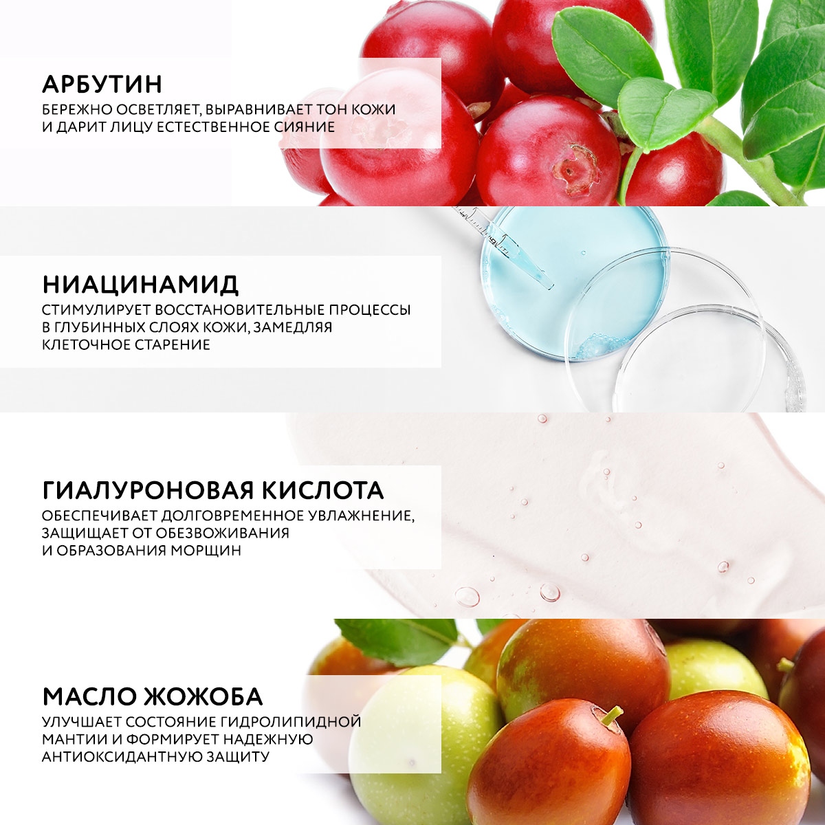 Сыворотка основана на двух мощных осветляющих компонентах — ниацинамиде и арбутине. Уменьшает выраженность пигментных пятен и покраснений, оказывает антиоксидантное действие. При регулярном использовании выравнивает тон кожи и дарит лицу здоровое сияние. За счет компонента гиалуроновой кислоты — обеспечивает долговременное и высокоинтенсивное увлажнение кожи, защищает от обезвоживания и образования преждевременных морщин.
