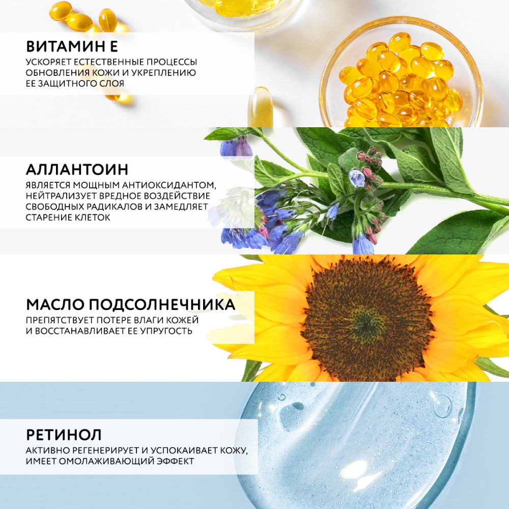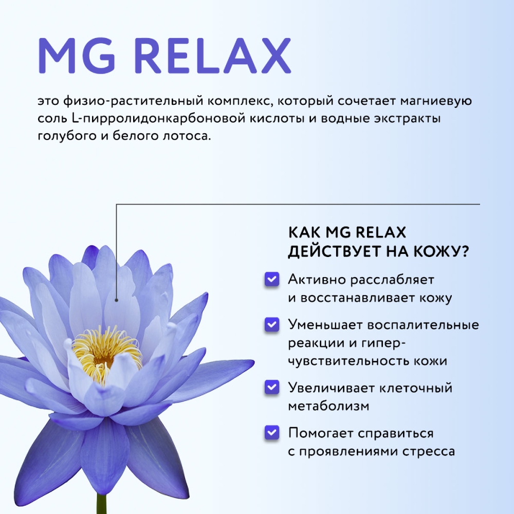 Ночной крем на основе мощного комплекса MG Relax восстанавливает кожу в ночное время, делает ее гладкой и сияющей. Комплекс MG Relax содержит магний, воду голубого и орехоносного лотоса, которые помогают снять напряжение и расслабить мышцы лица, что способствует уменьшению морщин. Гиалуроновая кислота в составе крема восстанавливает гидро-липидную мантию и водный баланс. Витамин Е, масла ши и авокадо являются отличными увлажняющими и питательными ингредиентами, которые помогают улучшить общее состояние кожи, сделать ее мягкой и наполненной. Ретинол (витамин А) способствует омоложению, сокращает глубину имеющихся морщин и препятствует появлению новых. Аллантоин помогает в синтезе собственного коллагена, а также смягчает и предотвращает сухость и шелушение. Масло жожоба быстро проникает в дерму, заботясь о гидролипидном балансе кожи. Прекрасно подходит для ежедневного применения для всех типов кожи.