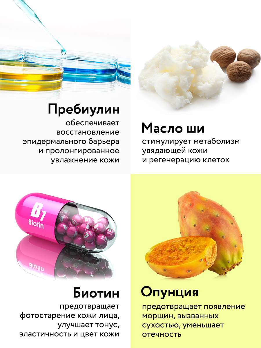 Эффективная формула ночного средства на основе комплекса пребиотиков и биотина способствует активному омоложению, повышению уровня упругости и эластичности кожи, улучшению микробиома. Пребиулин нормализуют состояние гидролипидной мантии, помогает нейтрализовать признаки усталости, несовершенства и морщины. Биотин укрепляет естественную защиту кожи, формирует надежный барьер от негативного воздействия среды и предотвращает признаки фотостарения. Экстракты зеленого чая и кактуса-опунции обеспечивают антиоксидантное действие, успокаивают и выравнивают тон. Масло авокадо в сочетании с маслами жожоба и ореха ши способствуют интенсивному питанию кожи, восполняют недостаток витаминов, макро- и микроэлементов, помогают устранить сухость.