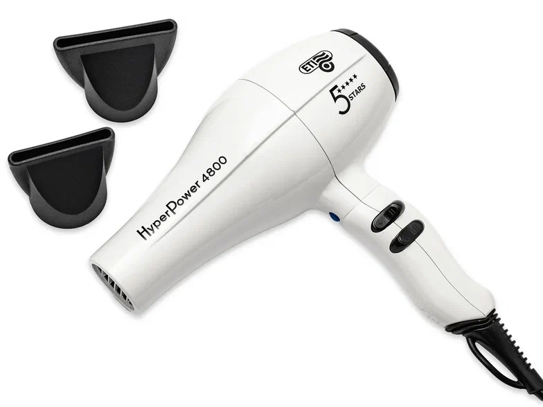 Фен ETI Hyper Power 4800, 2600 ватт, белый. Белый. Стильный. Мощный Все это профессиональный фен ETI Hyper Power 4800. Созданный для интенсивной работы в условиях салона. Современный мотор переменного тока с ресурсом 2500 часов работы не перегревается. Равномерно нагревает воздух и быстро переключается между температурами. Фен отличается не только характеристиками, но и продуманным дизайном. Бесспорно будет привлекать внимание качеством работы, но и стильным корпусом. Ручка комфортно ложится в руку. Положение кнопок позволяет переключаться между 4 температурными режимами и 2 скоростями без усилий. Вес фена 550 грамм оптимально распределяется и не ощущается в руке. Решетка воздухозаборника легко снимается и очищается. Длина провода 3 метра не ограничивает возможность передвижения вокруг кресла. Mощность 2600 Вт. Мотор: АС. Скорость воздушного потока: 110 м куб/час. Шум: 69 дБ. Режим холодного обдува: есть. Керамическая решётка. Две насадки. Сделано в Италии.