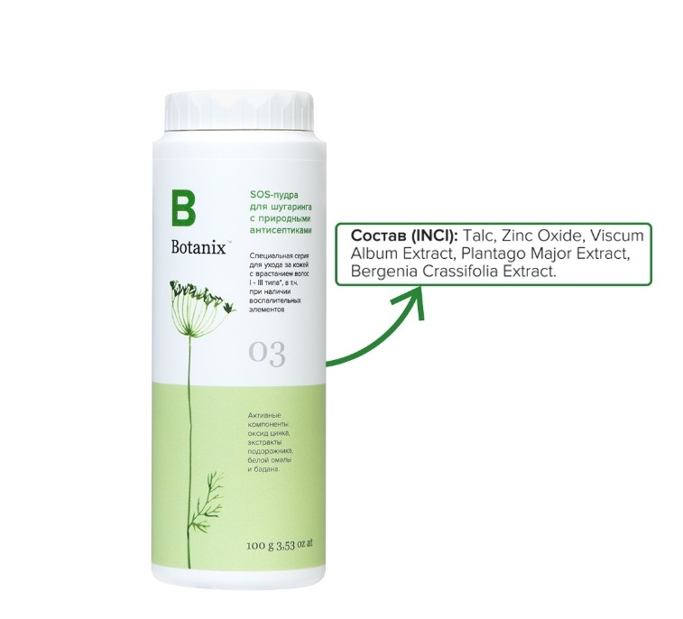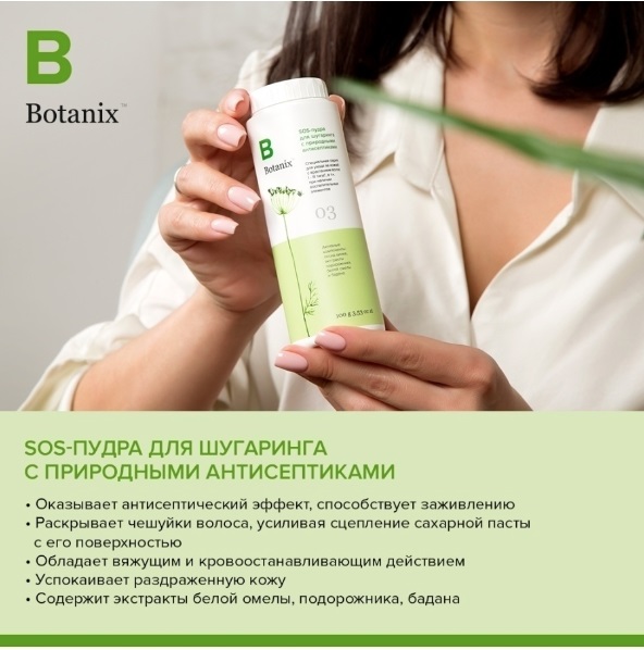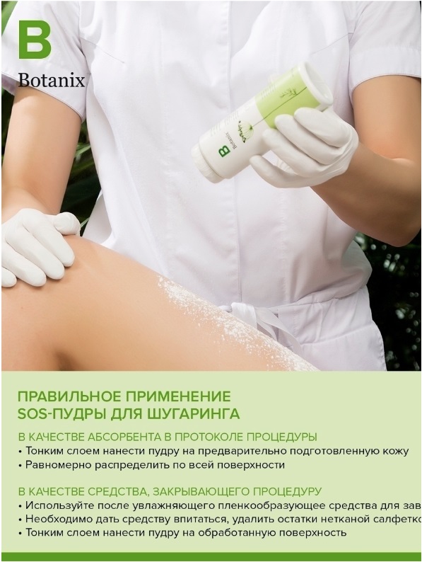 SOS-пудра Botanix поможет идеально провести процедуру шугаринга.Во время процедуры пудра создает равномерную тонкую пленку-протектор, снижая риск механического обламывания волоса. Оказывает антисептическое действие, раскрывает чешуйки волоса, усиливая сцепление сахарной пасты с его поверхностью. Эффективно удаляет влагу.При использовании после процедуры успокаивает раздраженную кожу. Экстракты в составе оказывают вяжущее и кровоостанавливающее действие.Рекомендовано для использования на коже с гипергидрозом и при обильном проявлении кровяной росы.