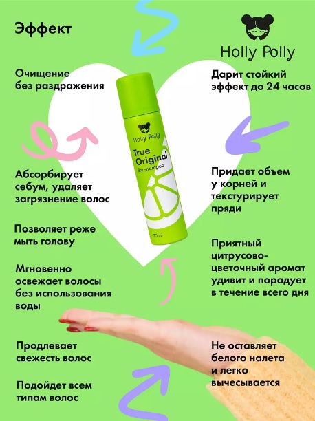 Если у вас нет времени или возможности помыть голову обычным шампунем - на помощь спешат сухие шампуни Holly Polly! Продукт незаменим во время отпуска, в поездках, в период отключения горячей воды, после тренировки в зале или перед срочной встречей. Уникальная формула устраняет загрязнения и жирность у корней. Придает волосам свежесть, силу, блеск и объем. Сухой шампунь не сушит кожу головы и является безвредным абсорбентом. Подходит для всех типов волос. Легкий цветочный аромат в сочетании со свежими цветочными нотами позволит наслаждаться чистыми и пышными волосами.