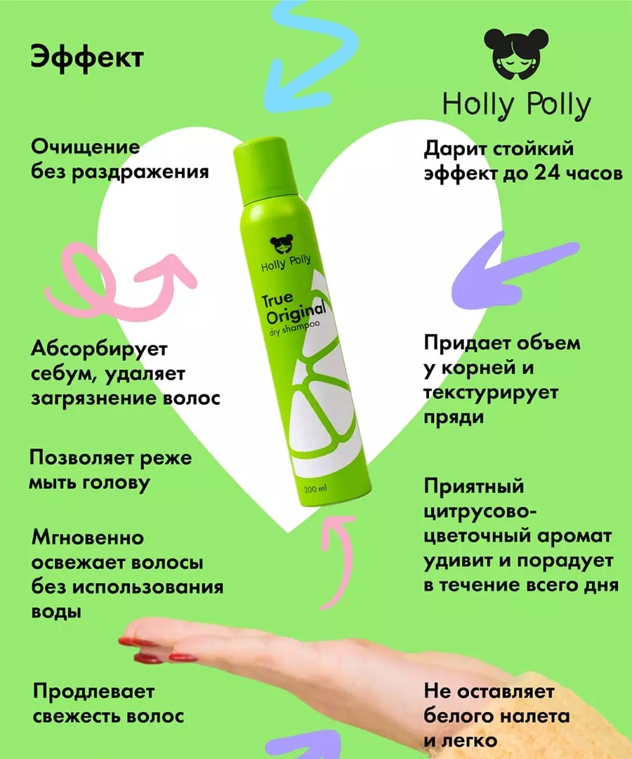 Если у вас нет времени или возможности помыть голову обычным шампунем - на помощь спешат сухие шампуни Holly Polly! Продукт незаменим во время отпуска, в поездках, в период отключения горячей воды, после тренировки в зале или перед срочной встречей. Уникальная формула устраняет загрязнения и жирность у корней. Придает волосам свежесть, силу, блеск и объем. Сухой шампунь не сушит кожу головы и является безвредным абсорбентом. Подходит для всех типов волос. Легкий цветочный аромат в сочетании со свежими цветочными нотами позволит наслаждаться чистыми и пышными волосами.