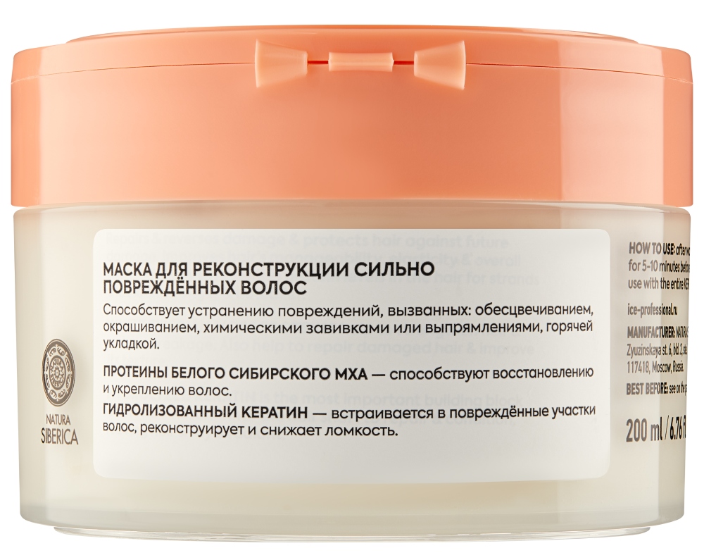 МАСКА ДЛЯ РЕКОНСТРУКЦИИ СИЛЬНО ПОВРЕЖДЁННЫХ ВОЛОС Способствует устранению повреждений, вызванных: обесцвечиванием, окрашиванием, химическими завивками или выпрямлением, горячей укладкой. ПРОТЕИНЫ БЕЛОГО СИБИРСКОГО МХА — способствуют восстановлению и укреплению волос. РАСТИТЕЛЬНЫЙ КЕРАТИН — встраивается в повреждённые участки волос, реконструирует и снижает ломкость.