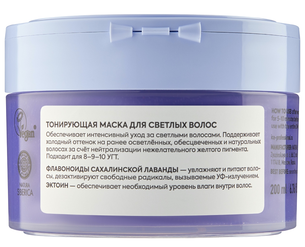ТОНИРУЮЩАЯ МАСКА ДЛЯ СВЕТЛЫХ ВОЛОС Обеспечивает интенсивный уход за светлыми волосами. Поддерживает холодный оттенок на ранее осветлённых, обесцвеченных и натуральных волосах за счёт нейтрализации нежелательного жёлтого пигмента. Подходит для 8-9-10 УГТ. ФЛАВОНОИДЫ САХАЛИНСКОЙ ЛАВАНДЫ — увлажняют и питают волосы, дезактивируют свободные радикалы, вызываемые УФ-излучением. ЭКТОИН — обеспечивает необходимый уровень влаги внутри волос.