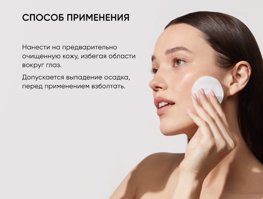 Нанести на предварительно очищенную кожу с помощью ватного диска, избегая области вокруг глаз. Допускается выпадение осадка, перед применением взболтать.