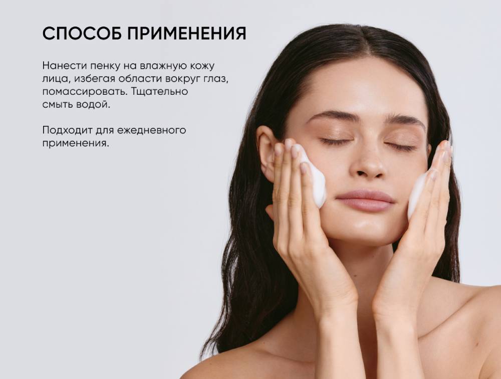 Нанести пенку на влажную кожу лица, избегая области вокруг глаз, помассировать. Тщательно смыть водой. Подходит для ежедневного применения.