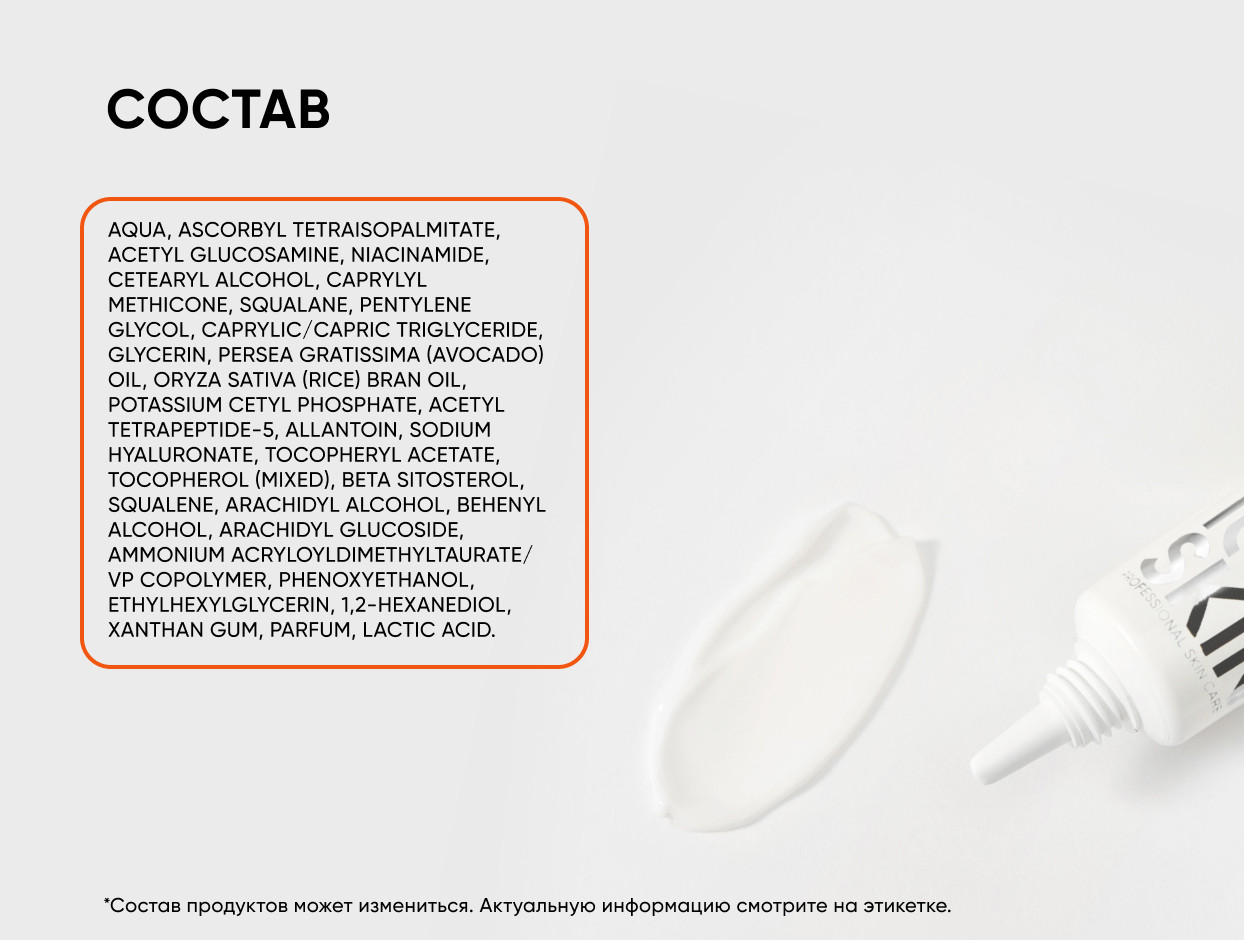 Крем для кожи вокруг глаз эффективно борется с признаками усталости и уменьшает темные круги под глазами. Витамин С в стабильной форме и ниацинамид (B3) выравнивают тон и улучшают текстуру кожи. Пептид и гиалуроновая кислота обеспечивают глубокое увлажнение и уменьшают признаки возрастных изменений: способствуют сокращению видимости морщин, повышают упругость, эластичность и тургор кожи вокруг глаз. Крем имеет нежную текстуру и быстро впитывается. РЕЗУЛЬТАТ: свежий взгляд, упругая и увлажненная кожа вокруг глаз без темных кругов.