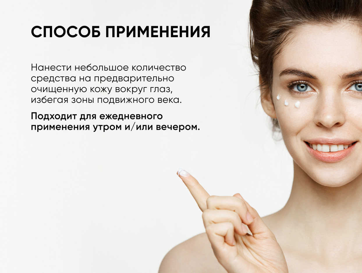 Нанести небольшое количество средства на предварительно очищенную кожу вокруг глаз, избегая зоны подвижного века. Крем подходит для ежедневного применения утром и/или вечером.