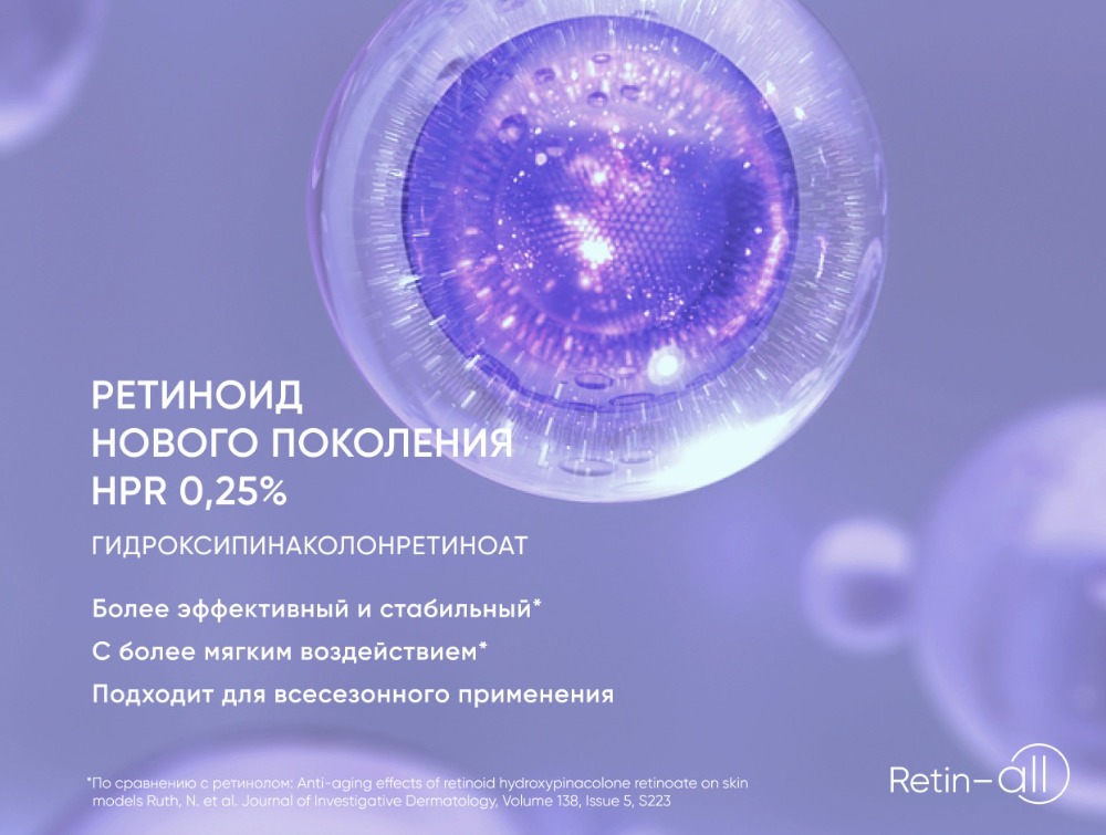 Крем c 0,25% HPR Retin-All разработан как альтернатива «классическому» уходу с содержанием ретинола. Крем подойдет для первого знакомства кожи с ретиноидами или для мягкого ухода в летний период. Кроме того, Retin-All может стать средством предпочтительного выбора для кожи, для которой рекомендован уход с ретиноидами, но применение ретинола нежелательно в силу индивидуальной непереносимости.Ключевой ингредиент крема, гидроксипинаколонретиноат (HPR) — инновационный актив, ретиноид нового поколения. Механизм его действия более совершенен по сравнению с ретинолом: HPR связывается с ретиноидными рецепторами кожи, производя прямое действие. Он более биодоступен, стабилен и устойчив к окислению. Обладая более высокой активностью, HPR действует мягче ретинола, меньше раздражает кожу, и при соблюдении рекомендаций по применению может подходить даже при повышенной чувствительности. Действие HPR дополняют и усиливают бакучиол (растительный аналог ретинола) и церамиды. Retin-All — идеальная формула для заметного преобра
