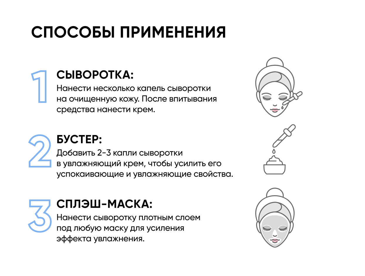 Сыворотка-концентрат подходит для ежедневного применения. Вариант 1: сыворотка. Нанести несколько капель сыворотки на предварительно очищенную кожу. После впитывания средства рекомендуется нанести крем, подходящий вашей коже. Вариант 2: бустер. Добавить 2-3 капли концентрата в увлажняющий крем, чтобы усилить его успокаивающие и увлажняющие свойства. Вариант 3: сплэш-маска: нанести сыворотку плотным слоем под любую маску для усиления эффекта увлажнения. Для достижения оптимального результата рекомендуется применять сыворотку-концентрат не менее 1 месяца.