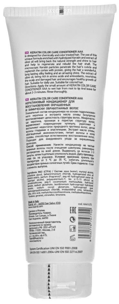 KAARAL Кератиновый кондиционер для восстановления окрашенных и химически обработанных волос 250 мл