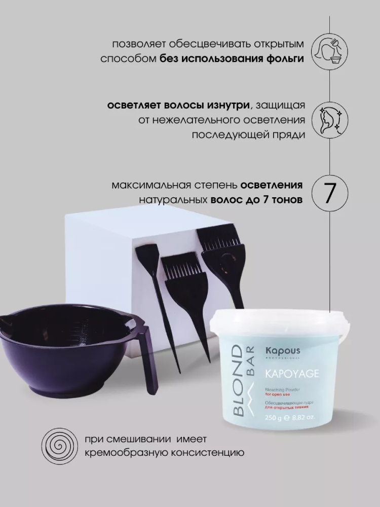 Обесцвечивающая пудра предназначена для выполнения открытых техник окрашивания. Ее особенность в капсулировании окрашивающей смеси после нанесения на прядь. Окрашенная красителем прядь не требует оборачивание в фольгу. Активная формула обесцвечивает локоны до 7 тонов, качественно подготавливая пряди к дальнейшему тонированию. Пудра может использоваться для всех типов волос.