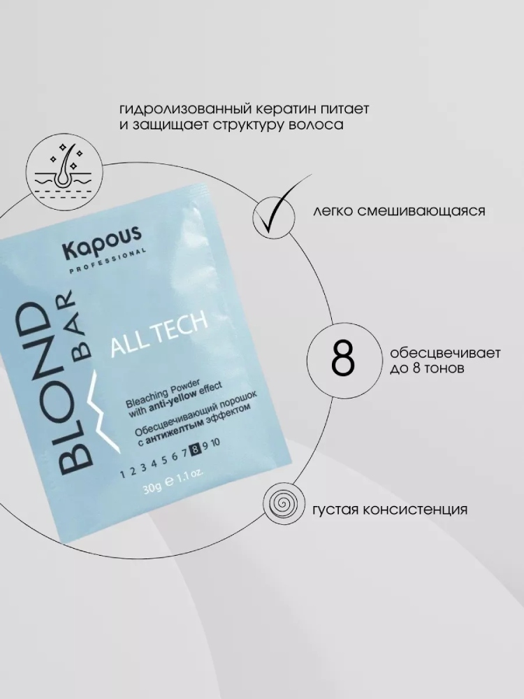 Обесцвечивающий порошок «All tech» с антижёлтым эффектом Kapous серии "Blond Bar" обесцвечивает до 8 тонов. Комплекс «GRIGIA» оптимально нейтрализует фон осветления. При смешивании с окислительной эмульсией пудра приобретает кремообразную консистенцию. Легко наносится и не образует пыли. Входящий в состав гидролизованный кератин питает и защищает структуру волоса, придает блеск и кондиционирует. «All tech» – это инструмент для создания яркого, идеального блонда.