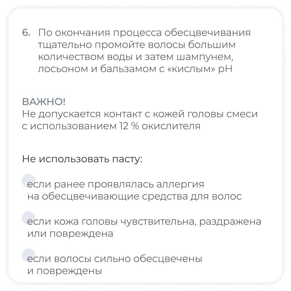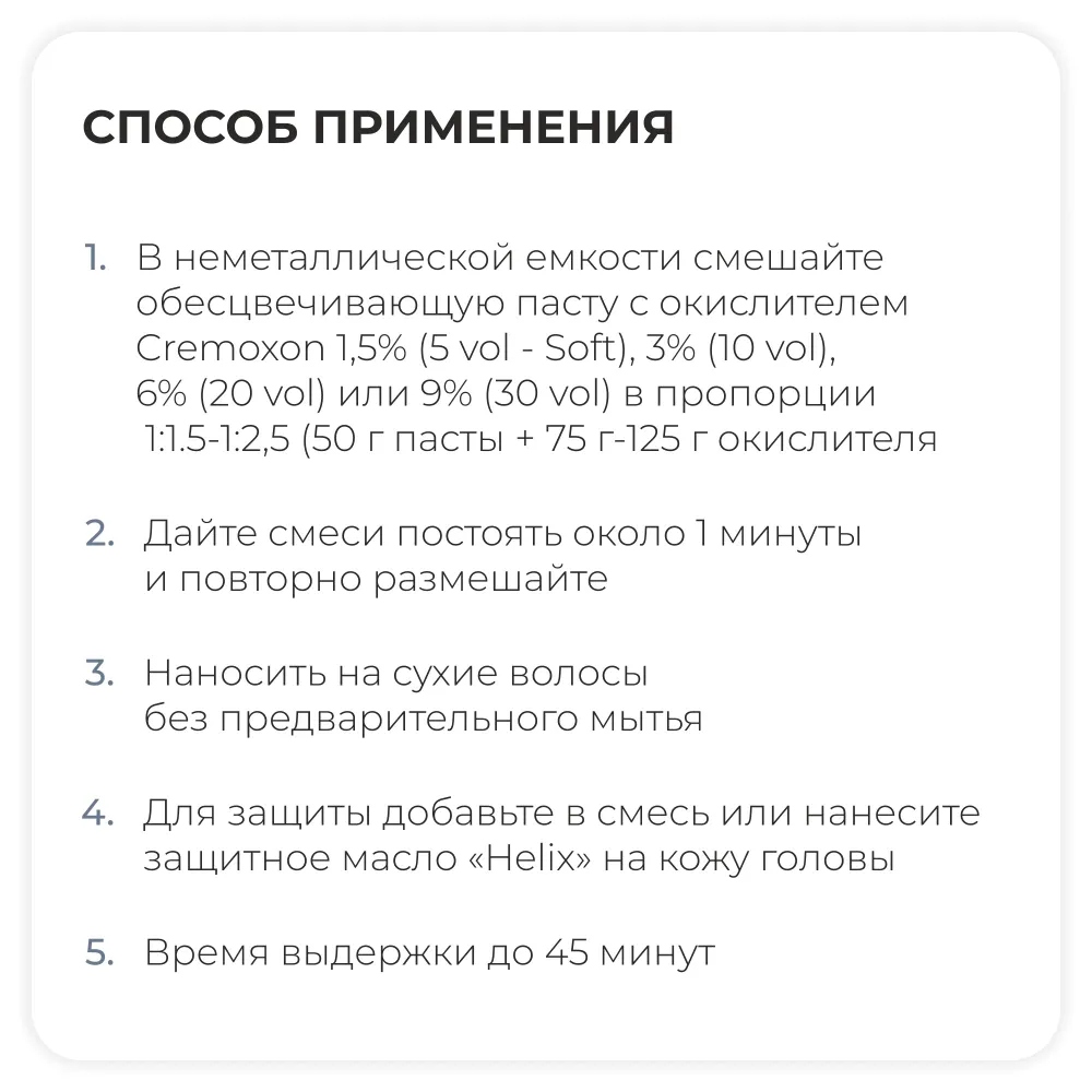 В неметаллической емкости смешать обесцвечивающую пасту с окислителем «Blond Cremoxon» 1,5% (5 vol - Soft), 3% (10 vol), 6% (20 vol) или 9% (30 vol) в пропорции 1:1.5-1:2,5 (50 г пасты + 75 г-125 г окислителя). Меры предосторожности: при первичном применении необходимо произвести тест на чувствительность! На чистую кожу за ухом или на изгибе локтя нанести смесь пасты с окислителем и оставить на 2-3 часа. Если появилось раздражение, использование пасты не рекомендуется! Может вызывать аллергическую реакцию. Не использовать для осветления бровей и ресниц. Избегать контакта с глазами. При попадании в глаза немедленно промыть обильным количеством воды и обратиться к врачу. Использовать защитные перчатки. Использовать в хорошо проветриваемом помещении. Хранить в сухом месте, не допускать попадания влаги. Хранить в недоступном для детей месте. Следует соблюдать особые меры предосторожности и не использовать обесцвечивающую пасту: -если ранее проявлялась аллергическая реакция на обесцвечивающие средства для волос;